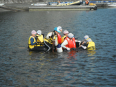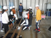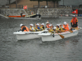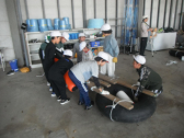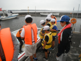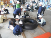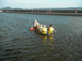 入所式後、いかだ遊びを行いました。班ごとに角材やタイヤチューブを使っていかだを作り、それを浜名湖に浮かべてみんなで漕ぐというものです。全員が安定して乗るいかだを作ることは難しかったようです。