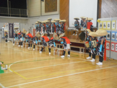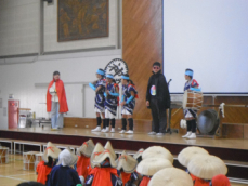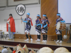 まず、放歌踊りが披露されました。本年度6月から練習を続けていたクラブ員が歌声、鐘、太鼓、笛の音をそろえ荘厳な演奏を披露しました。おかめとひょっとこがみんなの厄を落とし、幸せを招きました。