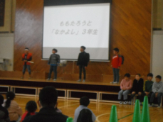 1.  9:00、3年生の「ももたろうとなかよし3年生」が始まりました。都田に鬼退治に来た桃太郎が、3年生と一緒にお店や風穴を回り、都田には鬼がいないことに納得するお話でした。大きな声とジェスチャー、きれいなリコーダー演奏で大きな拍手を受けていました。