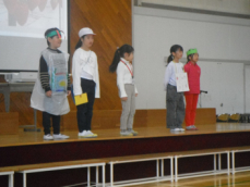 9:30、5年生「どこでも door でどこまでも!」が始まりました。分数の紹介の後、学習をしたスズキ自動車工場や水田にどこでもドアで行き、その様子を紹介するというお話でした。5年生一人一人の役になり切った演技がとっても上手で、思わず笑ってしまいました。