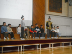 10:40、6年生の「みやこだ タイムスリッパー 2025 ~大人への第一歩~」が始まりました。授業中に居眠りをした主人公が、魔女にタイムスリップをかけられて飛鳥時代や戦国時代を巡ったり、総合的な学習の時間にお世話になった方々の生きざまを紹介したりする、というお話でした。登場した 聖徳太子や中大兄皇子、織田信長、豊臣秀吉が迫力ある演技を披露しました。
