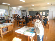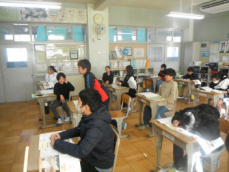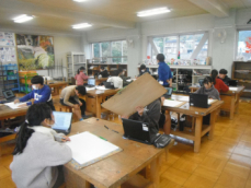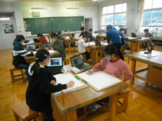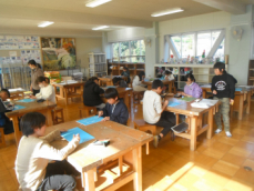 図工室では6年生が水彩画の下描きに取り組んでいました。校内のお気に入りの場所を描くのだそうです。図書室や体育館を描いている子供がいました。出来上がりが楽しみです。