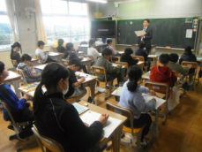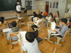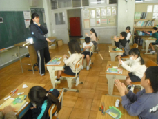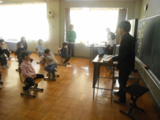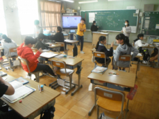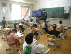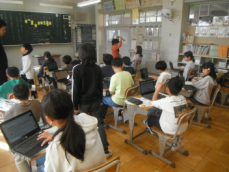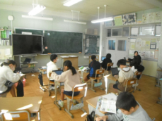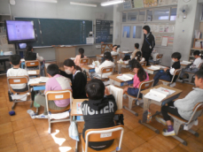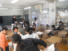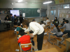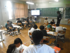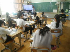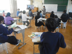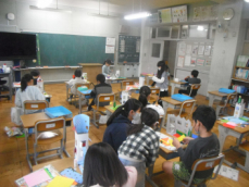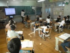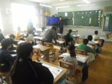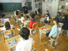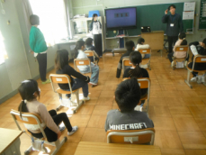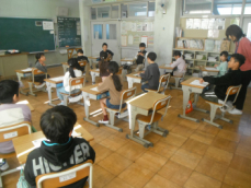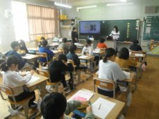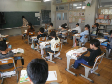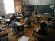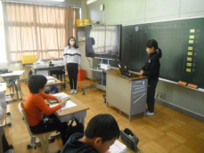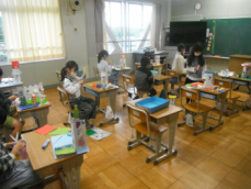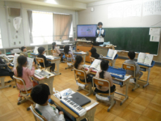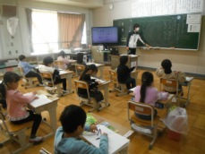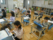 5時間目です。1年生の教室からは、鍵盤ハーモニカの合奏が聞こえてきました。「ひのまる」を演奏していました。担任がきれいな演奏法を話すと、みんな真剣に聞いていました。