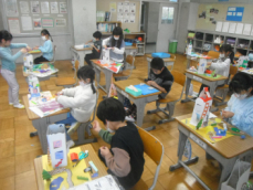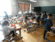 3時間目です。2年生は生活科の授業でした。一人一人が、ぴょんぴょんコップやトコトコ車などの動くおもちゃを一生懸命に作っていました。3学期には1年生を招待して、おもちゃで遊んでもらうんだそうです。