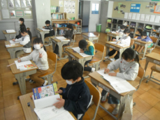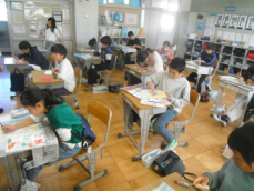 2年生は国語の授業でした。おもちゃの作り方を説明する文章を書いていました。ヨットカーやぴょんコップなどの作り方を絵を交えながら書いていました。つなぎ言葉をうまく使えると、分かりやすくなりますね。
