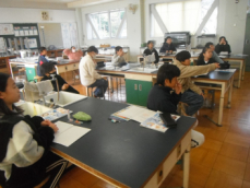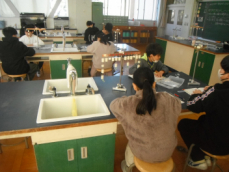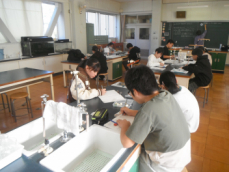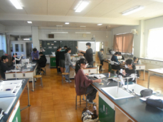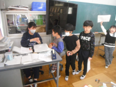 理科室では5年生が実験に取り掛かろうとしていました。この後、ろ液の中に溶けている物を水分を蒸発させて取り出す、という実験に取り組むんだそうです。