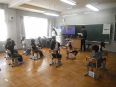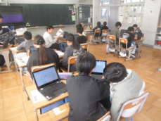 音楽室では5年生が「まちぼうけ」を鑑賞していました。男性歌手の迫力ある歌声に、みんな驚いているようでした。歌手が呼吸を十分にし口を大きく開けている様子が画面からうかがえました。