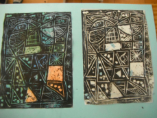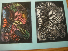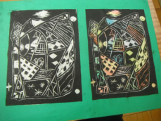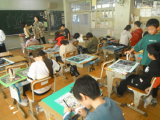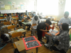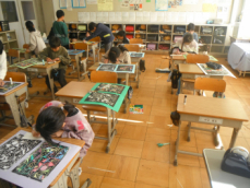 4年生は図工の授業でした。完成した版画を台紙に貼ったりお互いに見合ったりしていました。いろいろな彫刻刀を使って色んな彫り方をし、きれいな模様が刷り上がっていました。