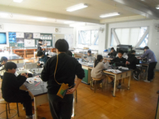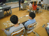 4時間目です。1年生は算数の授業でした。繰り下がりのある引き算の計算カードを机の上に並べ、答えが 9 になる式を探し出していました。12-3=9、15-6=9など、ぜひ、答えがパッと言えるように暗記してもらいたいものです。