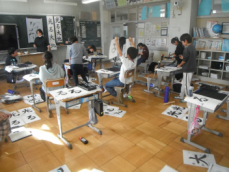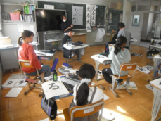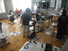 5年生は書初めの練習をしていました。太い毛筆で「光る大地」と書くんだそうです。「る」の結びが難しいと思います。