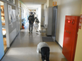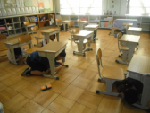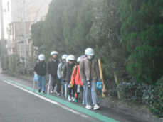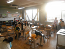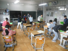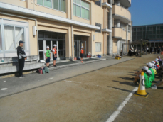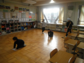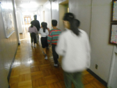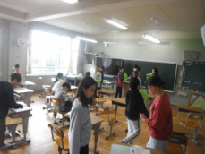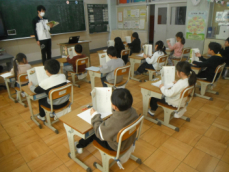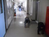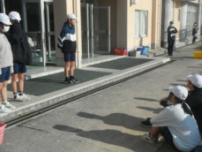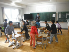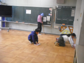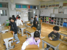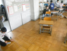 8:10、掃除が終わろうとしているその時、緊急放送が流れました。「訓練、訓練、大きな地震発生。直ちに自分の身を守りなさい。」抜き打ちの(子供たちには事前予告なしの)避難訓練が行われました。いつもの避難訓練とは全く違うシチュエーションでしたが、どの子供も落ち着いて身を守る体勢をとり、地震の終息、避難経路の安全確認が終わって、静かに運動場へ避難することができました。