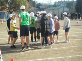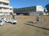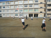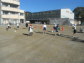 運動場では3年生がサッカーに挑戦していました。正確に相手にパスをする方法としてインサイドキックが担任から紹介され、子供たちは二人一組になってその練習をしていました。両膝を柔らかく、ボールを押し出すようにする感覚が必要です。