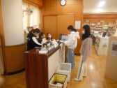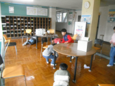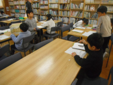2時間目です。1年生は図書室にいました。先日、一人一人が書いた物語の紹介文を、お互いに読み合っていました。「わたしも、おなじところがおもしろいとおもいます」「ぱんがしゃべるなんてふしぎです」などと、感想を書いている子供の姿を見ることができました。
