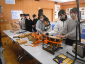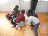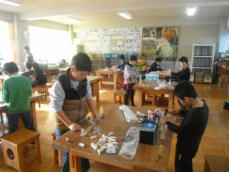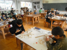 図工室では、4年生がのこぎりで細かく切った角材を釘やボンドでくっつけて、何かを形作ることに挑戦していました。家や動物を作ろうとしているようでした。完成が楽しみです。