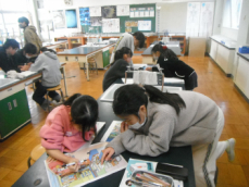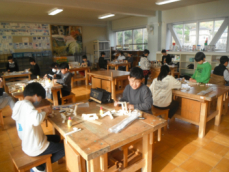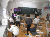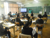 5年生は版画作品と書き初めを見合い、友達の作品で自分が気に入ったところを入力していました。版画では構図や色遣い、書き初めでは文字のバランスや止めやはねの仕方に注目しているようでした。