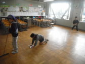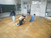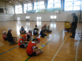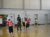 5年生は体育館でシートバスケットボールに挑戦していました。各チーム2枚のシートをコート上の好きな場所に置き、シートに入っている人には、相手は手出しができないんだそうです。シートをどこに置き、いかにそこの中にいる人にボールを回すかが勝敗の行方を左右するそうです。みんなが活躍できるようにするための工夫です。