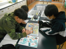 3年生は理科の授業でした。身の回りにある物で、磁石に付くものと付かないものを分類していました。「画鋲は付くよなぁ。」「輪ゴムは無理だなぁ。」なんて声が聞こえてきました。