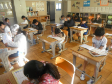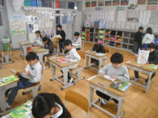 2時間目です。1年生は国語の授業でした。新しく習った漢字を振り返り、「いえの中」や「むら中」などと読み方がいくつもあるものを書いていました。終わってしまった子は読書を楽しんでいました。