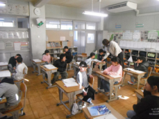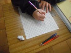5時間目です。5年生は算数の授業でした。三角形の面積は、なぜ「底辺×高さ÷2」で求められるのか、を考えていました。一人一人が方眼紙に平行四辺形を描き、それを基にして頭をひねっていました。