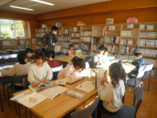 2時間目です。1年生は図書室でいろいろな本を読み、その中から気に入ったものをクラスメイトに紹介する、という学習に取り組んでいました。一人一人、本の気に入った箇所とその理由をノートに書いていました。