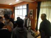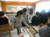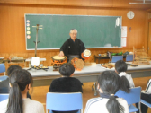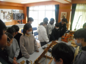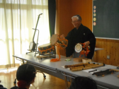 •  4時間目、芳華園の髙林行善先生をお招きして、6年生を対象に和楽器講座が開催されました。先生にお持ちいただいた尺八や三味線、小鼓などを実際に触ったり、先生の説明や演奏を聴いたりして、理解を深めました。私も尺八や小鼓を実際に間近で見るのは初めてで、本物の持つ迫力を感じることができました。
