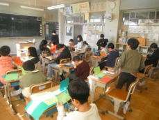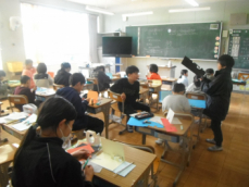 4年生は図工の授業でした。飛び出す手紙を作って身の回りの人に贈る、ということでした。画用紙の折り方や切れ込みの入れ方を工夫して、色々な形が飛び出るようにしていました。出来上がりが楽しみです。