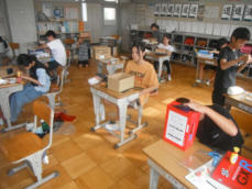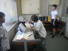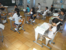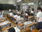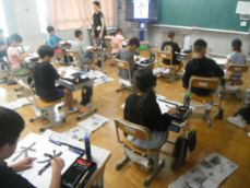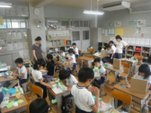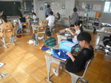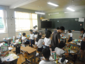 5年生は図工の授業でした。各自、箱やセロファン、わた、シールなどを家庭から持参して、「のぞいてみると」の制作に取り組んでいました。紙粘土で小さな動物を作っている子供もいました。完成が楽しみです。
