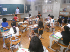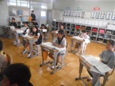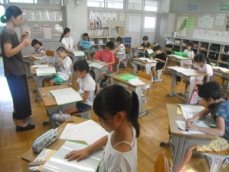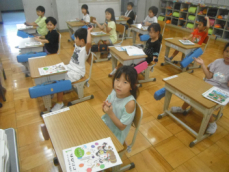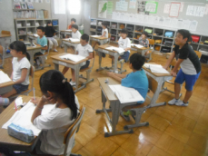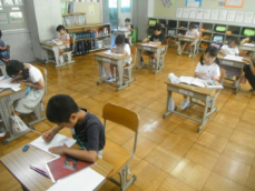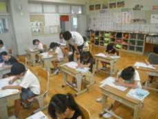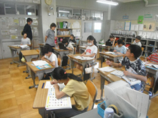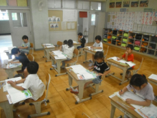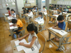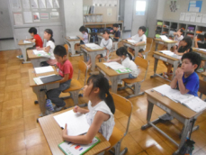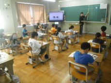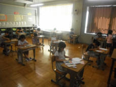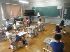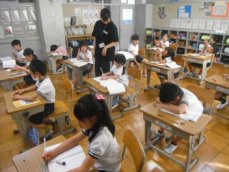 2年生は算数の授業でした。「時こくと時間」のテストに挑戦していました。早く終わってしまった子供たちは、予定を書いたり絵を描いたりしていました。