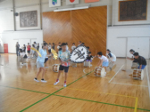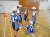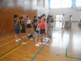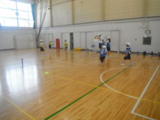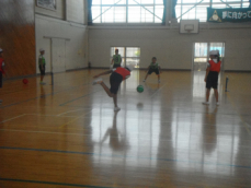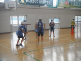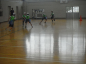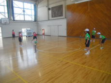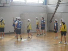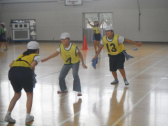 3年生は体育館で「フロアーボール」という球技に取り組んでいました。バレーボールコートを使い、1チーム3人ずつで対戦するんですが、転がってくるボールを手で止めたり相手コートに打ち返したりしていました。