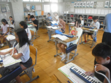 5年生は音楽の授業でした。鍵盤ハーモニカでソミドやラファドなどの和音の学習をしていました。