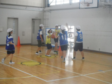 6年生は体育館で シートバスケットボール に挑戦していました。基本的なルールはバスケットボール通りなんですが、ゴール下にあるシートの中にいる人にパスが渡った場合には、ディフェンス側は手を出してはいけないんだそうです。