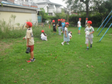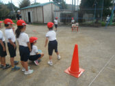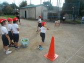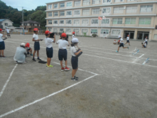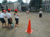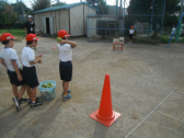 運動場から元気な声が聞こえてきました。足を運ぶと、1年生が「的当てゲーム」の練習をしていました。みんな、よくねらって投げていました。野球を習っているという子が、きれいなフォームから見事に命中させていました。