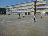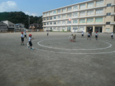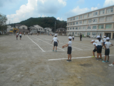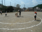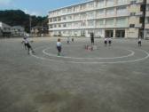 運動場から元気な声が聞こえてきました。1年生が 的当てゲーム を楽しんでいました。円の真ん中に置かれた段ボールにボールをぶつけて、何秒で全部を倒せるか、というゲームだということでした。20秒前後で倒すことができていて、「おぉ、なかなか・・・。」と感心しました。