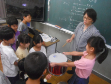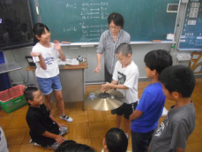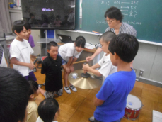 3年生は理科の実験をしていました。シンバルや小太鼓の音の大きさと振るえの大きさの関係を考えていました。やはり、音が大きければ大きいほど、振るえも大きくなるようでした。