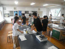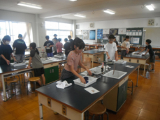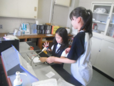 6年生は理科室で「水よう液の性質」を調べていました。塩酸やアンモニア水、石灰水などが準備され、それぞれの見た目や臭い、熱したときの様子を比べていました。理科支援員さんの話をよく聞き、安全に実験を進めていました。