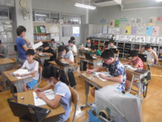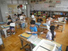 2年生は国語の授業で「どうぶつ園のじゅうい」を学習していました。獣医さんの仕事と自分の身の回りの出来事を比べて、思ったことや考えたことを書いていました。「日記を毎日続けていることがすごい」とか「ペンギンが飲み込んだボールペンを、取り出したことがすごい」などという記述が見られました。