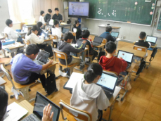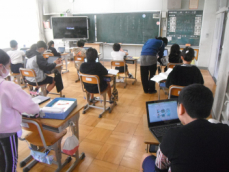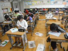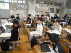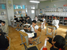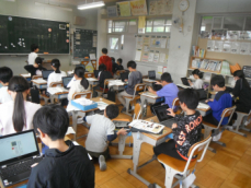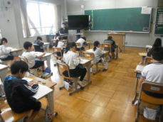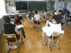 5年生は国語の授業でした。『固有種が教えてくれること』という教材文を読み、それを参考にして、一人一人が環境に関わる説明文を書く、ということでした。今は、そのための情報を集めているんだそうです。大気・海洋汚染や地球温暖化などについて、その原因や影響などを調べていました。