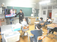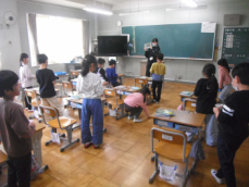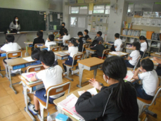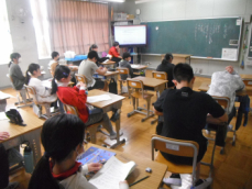 6年生は社会科の授業でした。江戸時代の出版物について学習していたらしく、近松門左衛門の名前が黒板に書かれていました。話は浅野内匠頭の江戸城中での刃傷沙汰、赤穂浪士の討ち入り事件に及んでいました。いわゆる『忠臣蔵』は日本人が大好きですね。