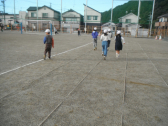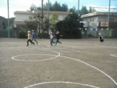 運動場では2年生が ボール投げゲーム に挑戦していました。相手の邪魔をかいくぐりながら、円の中に置かれたコーンにボールをぶつけるゲームだ、ということでした。円の外にいる味方と、いかに協力するかが大切なようです。