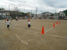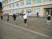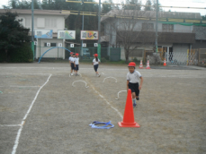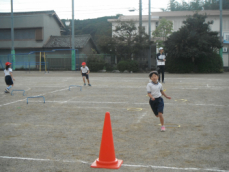 1年生は体育の授業でした。運動場に小さなハードルを並べて、そこをどれだけスムーズに走り抜けられるか競っていました。リズミカルに跳んでいる姿が見受けられました。