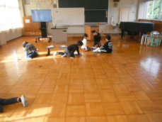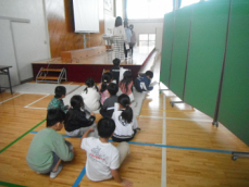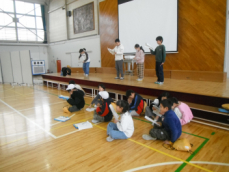 3時間目です。体育館へ向かうと、3年生が学習発表会の練習をしていました。大きな声でせりふを言ったり、それに合ったジェスチャーを付けたりして、たいへ立派な演技でした。舞台下の子供たちは静かに待っていました。