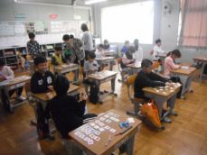 2年生は算数の授業でした。授業開始とともに、かけ算九九、5、2、3、4の段を唱えていました。慣れた子は40秒程度で、4つの段を言い終えていました。