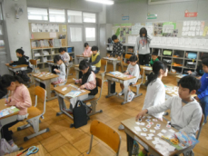 1年生も図工の授業でした。『にじいろのさかな』をもとに、一人一人がいろいろな 虹色の魚 を描き、それをもう一枚の画用紙に貼って、海の様子を表現していました。とってもカラフルな海中が誕生していました。