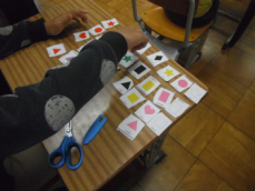 2時間目です。3年生は外国語活動の時間でした。机の上に色々な色の様々図形を並べ、「Green triangle.」や「Blue star.」などと元気よく発音していました。長方形を rectangle と表現することを初めて知りました。