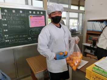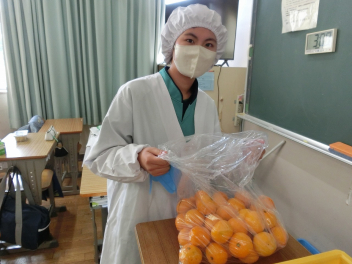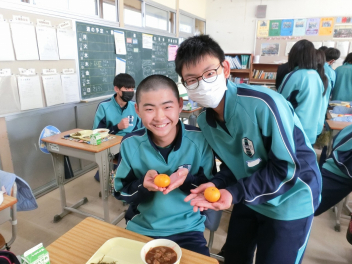 •  11月27日(木)の給食で、浜松市認定農業者協議会北支部より寄贈していただいた地域の特産品であるみかんを全校生徒でいただきました。産地ならではの新鮮な味わいを楽しむことで、地産地消の推進を図るとともに、生徒が地域の農業に関心を持つきっかけになればと思います。宮司支部長をはじめ浜松市認定農業者協議会北支部の皆様、ありがとうございました。