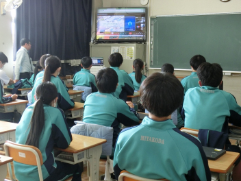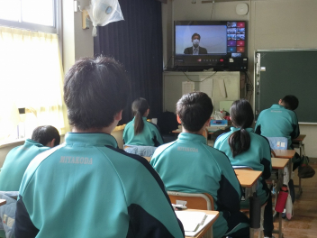 12月1日(月)の5校時に、浜松市青少年育成センターの袴田氏をお迎えし、全校生徒を対象に「すこやか集会」を開催しました。集会では「リアルなかかわりを大切に~メディアコントロールをしよう~」というテーマで、大変分かりやすくお話をしていただきました。SNS上のトラブルや依存について知るとともに、SNS上での人への思いの伝え方や受け取り方を考える良い機会となりました。