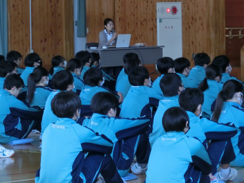 •  12月3日(水)に、79期生を対象に「いのちの授業」を開催しました。講師には聖隷三方原病院の梅田奈智加助産師をお迎えし、命の尊さについてお話をしていただきました。79期生にとって9年間の義務教育も残り4か月となりました。社会に出る前に命の大切さを再確認する大変貴重な機会となりました。
