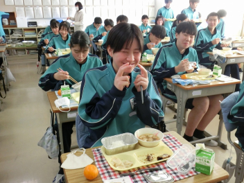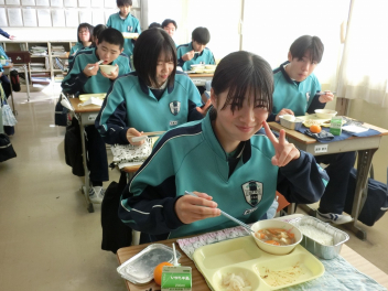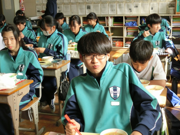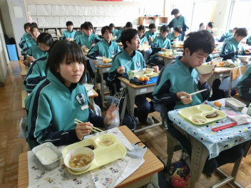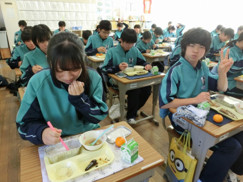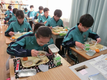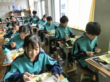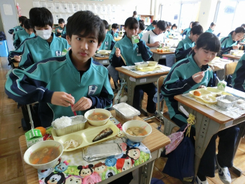 12月18日(木)は、2学期最後の給食でした。メニューは「米飯、牛乳、いわしの浜納豆煮、変わりづけ、のっぺい汁、みかん」でした。2学期も安心・安全な給食の提供ができました。御理解・御協力をありがとうございました。冬休みもバランスの良い食生活を心がけ、健康に過ごしてほしいと思います。