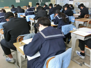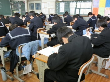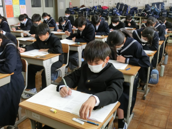 •  1月8日(木)は、80期生、81期生が静岡県中学校学力診断調査に取り組みました。年明け早々の学力診断調査となりますが、各学年のまとめとなる3学期の始まりに、自己の学力を分析する良い機会となります。調査の結果を自己分析し、学力向上に努めてほしいと思います。