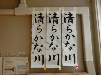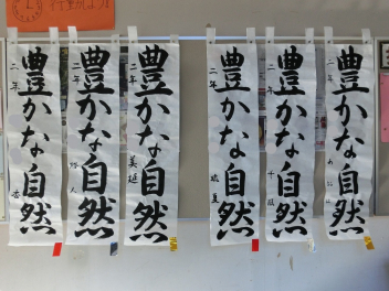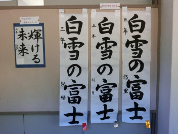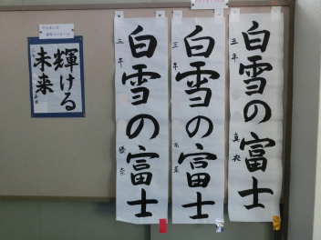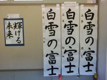 •  冬休みの課題の一つに書き初め作品の提出がありました。今年の課題は79期生が「白雪の富士」、80期生が「豊かな自然」、81期生が「清らかな川」でした。審査の結果、入賞した作品を以下に紹介させていただきます。